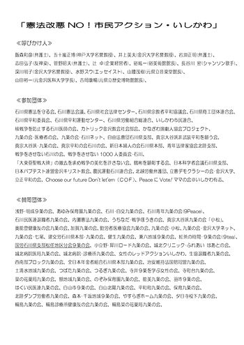 石川県内で開催される、「憲法9条」や「平和」をキーワードにした催し物、イベントなどの情報をお持ちの方は、ぜひ事務局までご連絡ください!