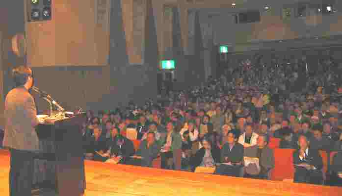 続いて九条の会事務局長の小森陽一東大教授からの「憲法のすばらしさ」と題した記念講演に移りました。九条改悪を狙うアメリカや財界の狙いを鋭く分析され、九条を中心とした「活憲」こそが平和をもたらすと熱く訴えられました(詳細は講演録やビデオをご覧ください)。
