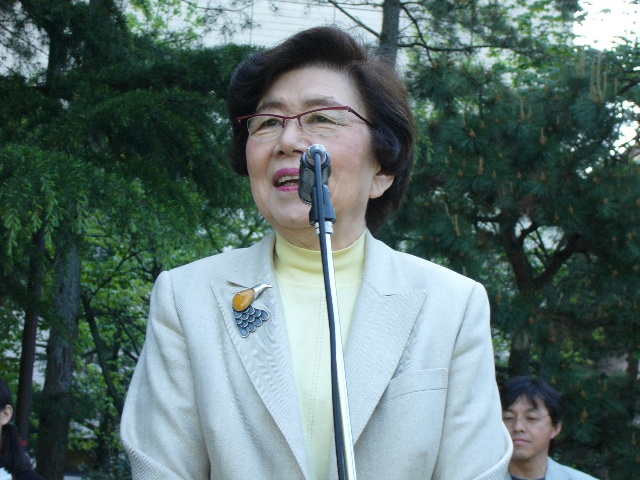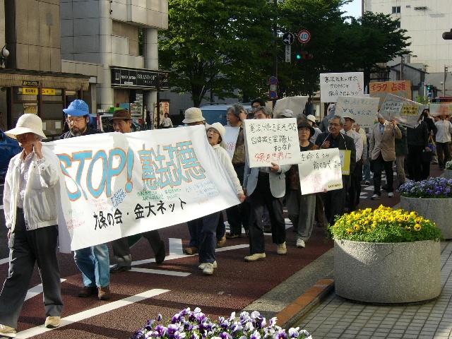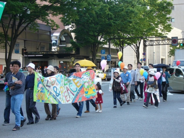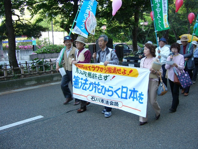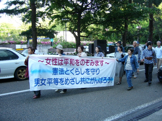 県内のフォークグループ「でえげっさ」の歌と演奏のあと、絵本の朗読や一分アピール、さらに、「憲法行脚の会」の土井たか子さんも激励に駆けつけ、大いに盛りあがりました。パレードも大成功。飛び込みでパレードに参加する若者の姿も見られました。