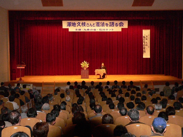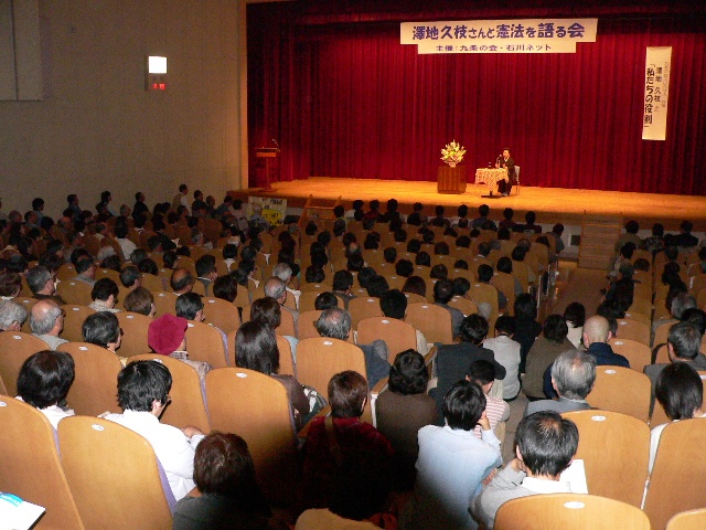 2005年5月15日(日)、金沢市の女性センターで全国の「九条の会」呼びかけ人でもある作家の澤地久枝さんを迎えての「語る会」には1階のホールや2階のモニター中継室を含め600人の市民の方々に参加していただきました。澤地さんは、河北郡高松町出身の川柳作家、鶴彬(つる・あきら)の生涯や全国の基地反対運動で先駆的役割を果たした内灘闘争のエピソードを紹介しながら「これまで日本は戦死者を1人もだしていなのは憲法9条があったから」「戦争をしない国、させない国にすることが私たちの責務」と語りました。