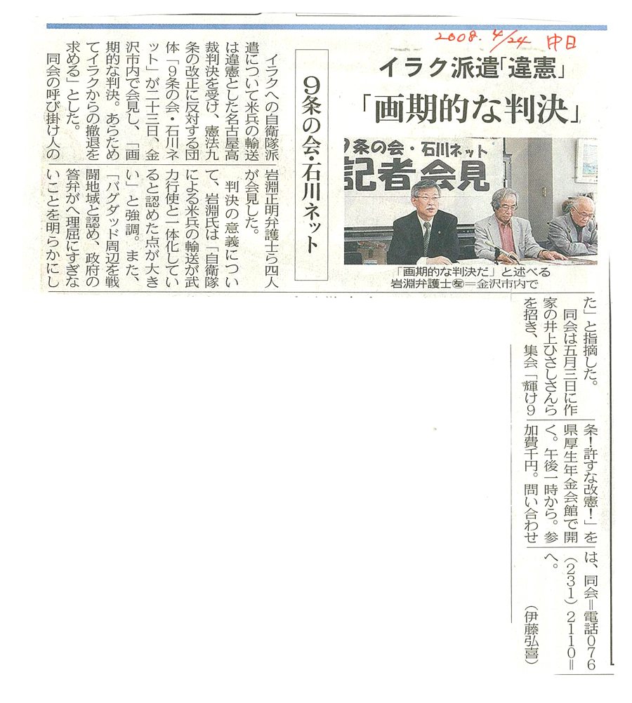 九条の会・石川ネットは、この間、九条を守り、生かし、その理念を実現するという立場からイラク派兵に反対し、撤退を求める声を上げ続けてきました。県内では小松基地から81人の隊員が派遣されており、現在も3名が現地で活動しています。戦闘地域での違法・違憲かつ危険な行動から直ちに撤退させるべきであり、今後の派兵も当然中止すべきです。私たちは今回の違憲判決を力に、自衛隊の海外派兵反対はもちろんのこと、九条を守り、平和を実現する取り組みをさらに広げていくことをここに表明します。