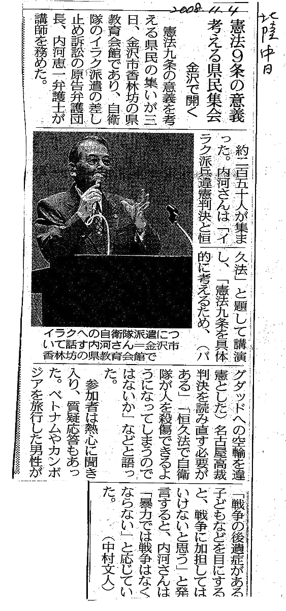 本日の集会で、私たちはイラク派兵違憲判決の意義と成果についてより深く学ぶことができました。イラク撤退表明の獲得で立ち止まることなく、この判決をさらに生かし、新テロ特措法の延長を許さず、派兵恒久法の制定も阻止する運動へとつなげていかなければなりません。判決はまた、平和的生存権を憲法上の法的な権利と認め、私たちが戦争被害を拒否できるだけでなく加害の強制も拒否できることを明らかにしました。まさに侵略戦争の反省から制定された日本国憲法の精神を踏まえたものであり、日本国憲法を擁護し、戦争に反対する私たちの取り組みを力強く後押しするものです。