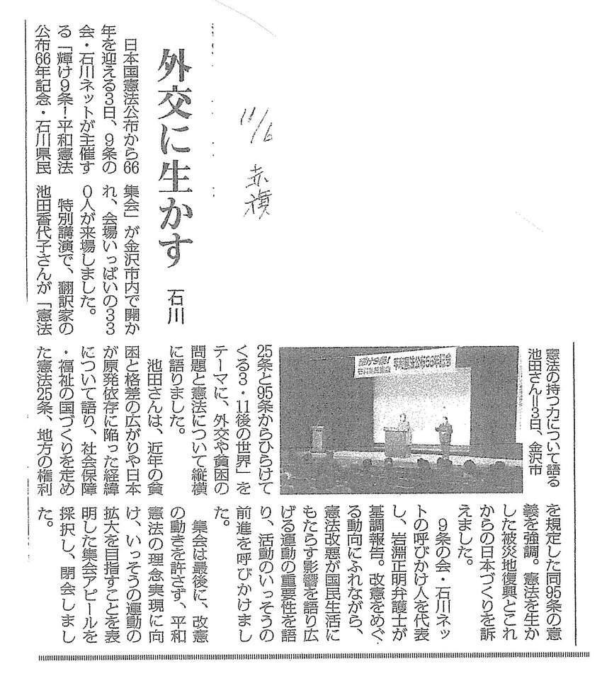 輝け9条!平和憲法公布66年記念石川県民集会