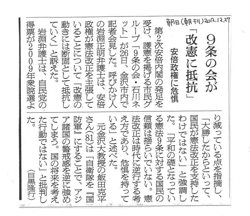 しかも、今回の選挙で国民が第9条の改定を支持したと見ることも到底できません。今回の選挙は、小選挙区の投票率が戦後最低の59.32%となりました。その中での自由民主党の得票は、小選挙区では、民主党に大敗した前回2009年から166万票も減らし、得票率は43%でした。比例代表でも219万票も減らし、得票率は30%にも達しませんでした。これを全有権者比率で見ると、自由民主党の得票率は、小選挙区で24.67%、比例代表で15.99%にすぎません。加えて、多くの投票者の関心は改憲にはありませんでした。石川県内でも、投票者の関心事は景気改善、税制、社会福祉、原発、外交安保にあり、これらで7割を超えます。一方、憲法問題を最も重視して投票した人は、わずか2%弱にすぎません。全国的傾向も同じです。これらからすれば、今回の選挙結果から国民が第9条の改定を求めているとは、とても言えないのです。