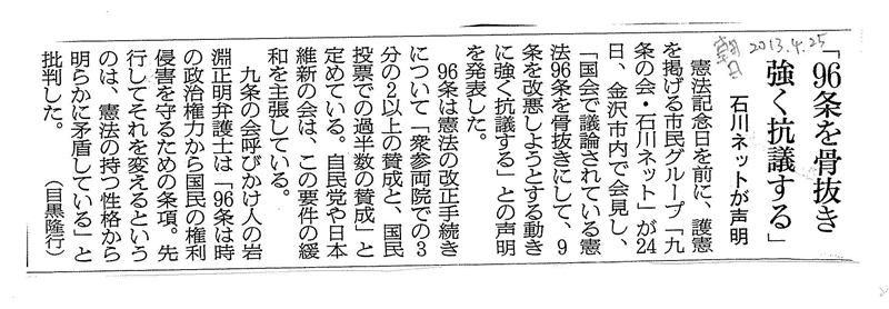 私たち「九条の会・石川ネット」は、現憲法の平和主義を定めた第9条を守ろうとの一点で共同行動する県民のネットワークとして発足し、活動を行なって来た。私たちは、今日、国会で議論されている、このような改憲条項である第96条を骨抜きにし、現憲法の要である第9条を改悪しようとする動きに強く抗議するものである。
