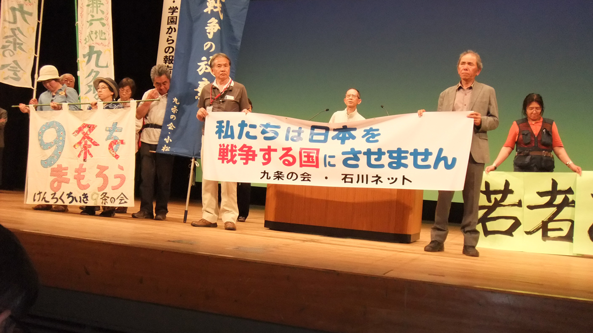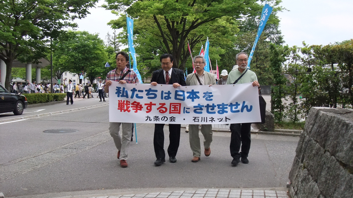 私たちは、日本国憲法施行68周年の記念日を迎えるに当たり、石川県民の皆さん、全国の皆さんに、力を合わせ、最大の努力をもって、第9条の改悪に向けた安倍政権による法整備に反対する活動を展開するように訴え、本日の集会アピールとします。