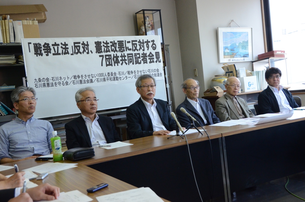 九条の会・石川ネット、石川県憲法を守る会、石川憲法会議、石川県平和運動センター、石川県労働組合総連合、戦争をさせない1000人委員会・石川、戦争をさせない石川の会の7団体が「戦争立法阻止のための共同声明」を発表しました。